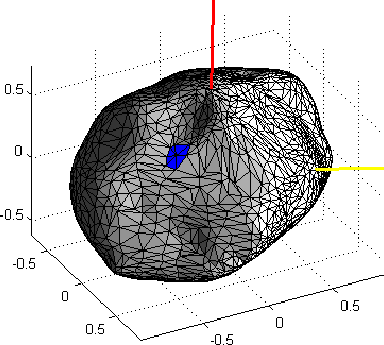 Indeed, by using a realistic 3-dimensional shape to define the surface of the nucleus, we intend to constrain better the emission geometry, but also to calculate a more realistic illumination profile of the active regions during a rotation phase. Our model can use any kind of 3-dimensional shape, from a sphere to a complex body with irregular features (see Fig. 1). As the surface is represented with a mesh of polygons (typically squares or triangles), illumination can be calculated with a basic raytracing algorithm. This approach provides a realistic estimation of the amount of light received by each surface element. If the nucleus is a pure sphere, the illumination profile is equivalent to a cosine function.