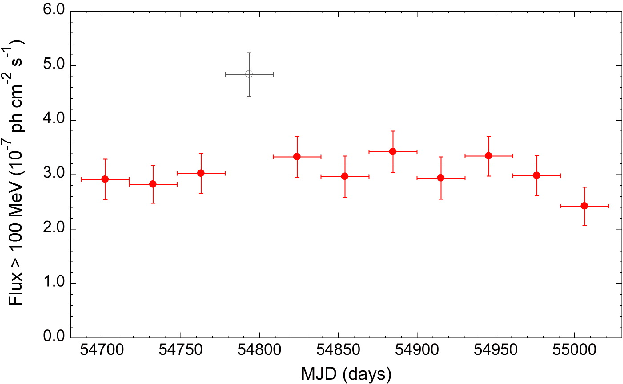 AcknowledgementsThe Fermi LAT Collaboration acknowledges generous ongoing support from a number of agencies and institutes that have supported both the development and the operation of the LAT as well as scientific data analysis. These include the National Aeronautics and Space Administration and the Department of Energy in the United States, the Commissariat à l'Energie Atomique and the Centre National de la Recherche Scientifique/Institut National de Physique Nucléaire et de Physique des Particules in France, the Agenzia Spaziale Italiana and the Istituto Nazionale di Fisica Nucleare in Italy, the Ministry of Education, Culture, Sports, Science and Technology (MEXT), High Energy Accelerator Research Organization (KEK) and Japan Aerospace Exploration Agency (JAXA) in Japan, and the K. A. Wallenberg Foundation, the Swedish Research Council and the Swedish National Space Board in Sweden. Additional support for science analysis during the operations phase is gratefully acknowledged from the Istituto Nazionale di Astrofisica in Italy and the and the Centre National d'Études Spatiales in France.
