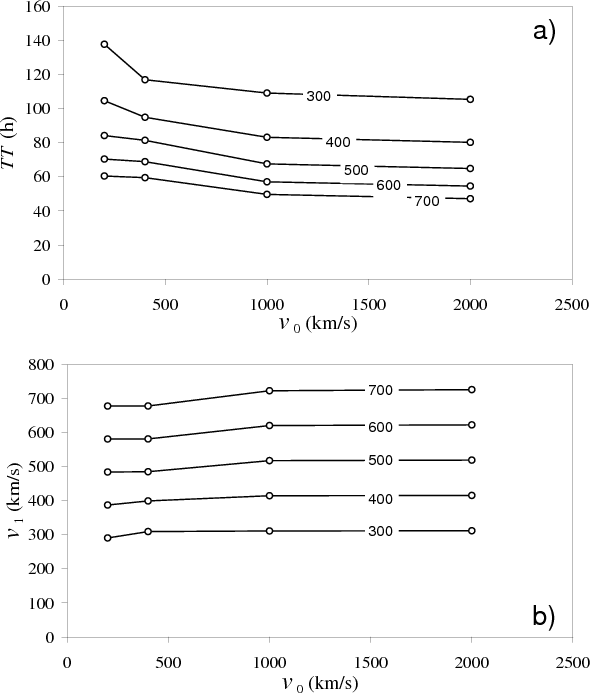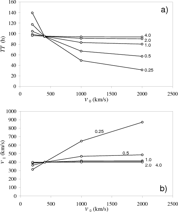 represents the 1 AU speed v1. The take-off velocity v0 at R0=20 (i.e., at t=0) is taken