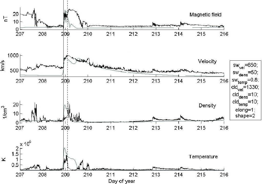 Figure 6: Comparison of the ENLIL results (smooth thin line) and the ACE in situ measurements (noisy thick line). Note signatures of the solar wind high-speed stream after DOY=210. Vertical full and dashed line indicate the shock and the leading edge of the ICME, respectively. |