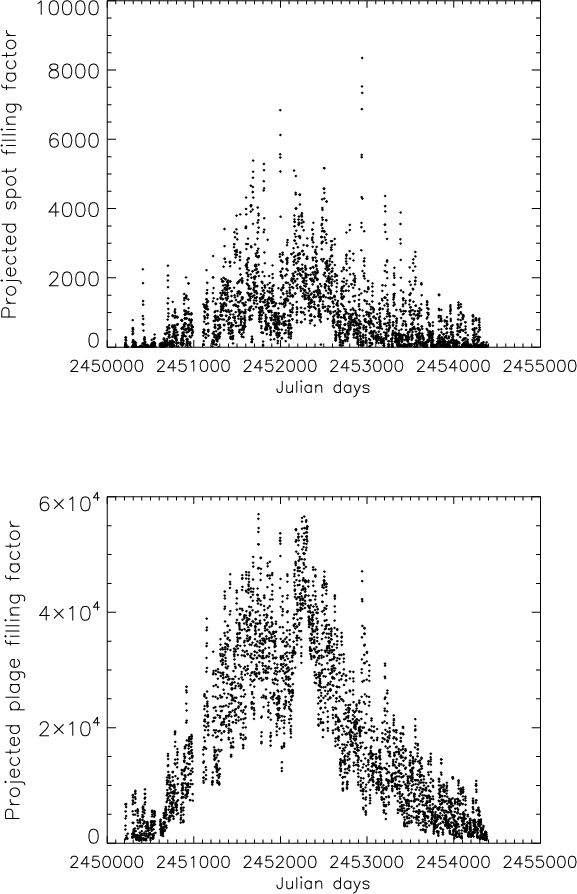 This sunspot data set has a few gaps. Some of them correspond to days without any spot while others are true gaps in the data. We removed the latter from the MDI data set by checking the Wolf number. In the following, there are therefore plage structures every day, but in some cases there may be no spot on the Sun surface. This leads to 3586 days, for a total duration of 4171 days (i.e. a 86% coverage, which is similar to what we had for spots in Paper I).