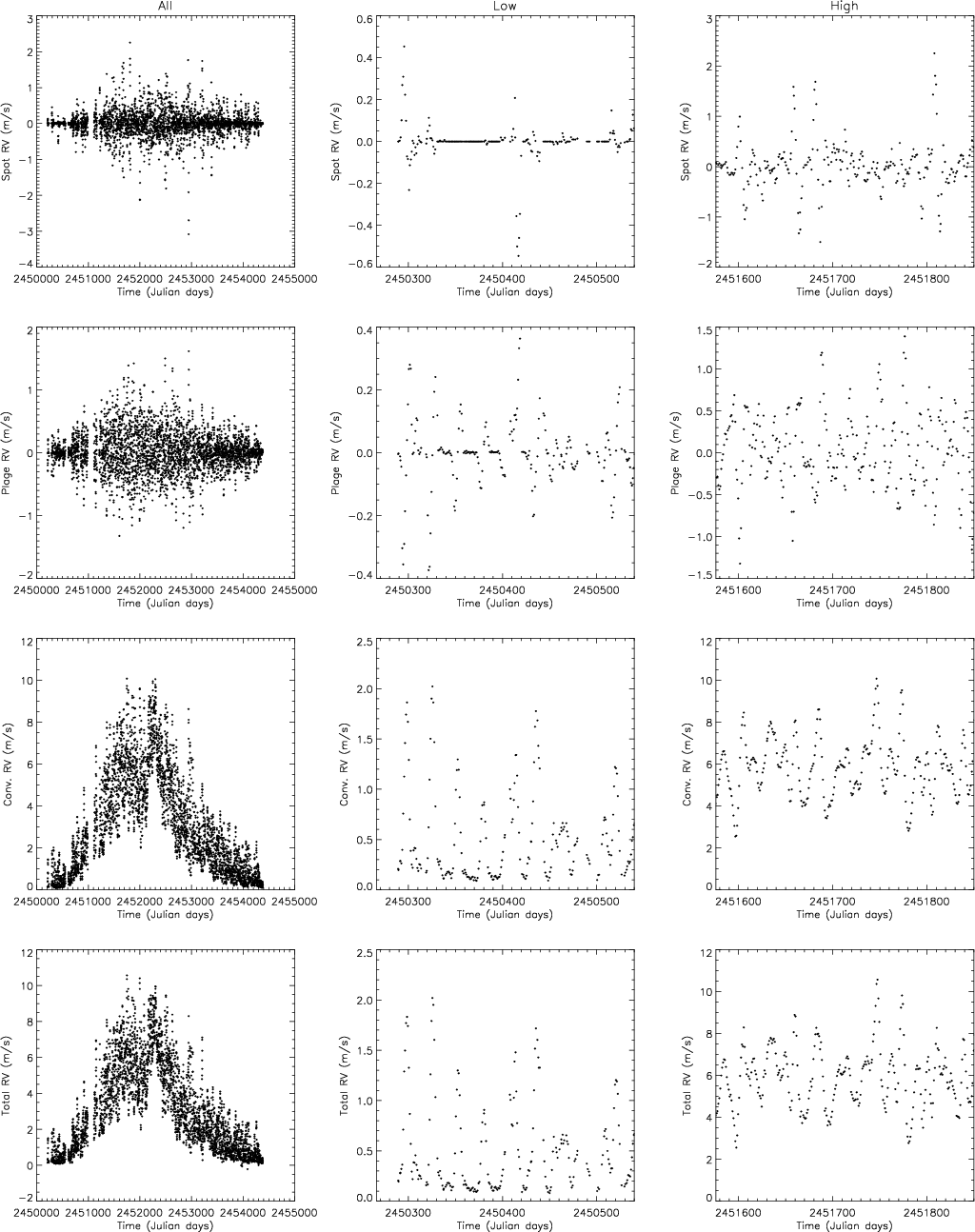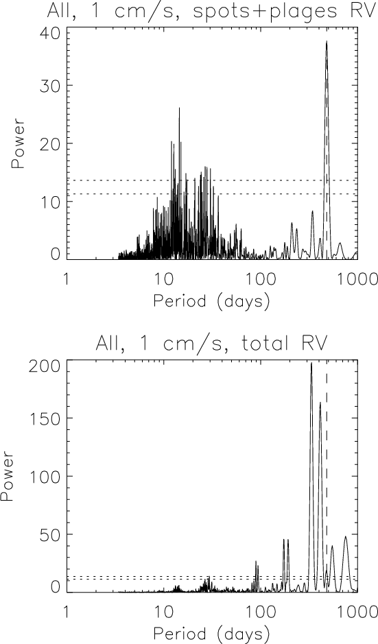 In conclusion, the photometric contribution to RV of both spots and plages at a level comparable to the Sun should not prevent detection of earth-like planets in the habitable zone around solar-like stars, providing a very good temporal sampling (better than 8 days and over a long monitoring period) and a good signal-to-noise ratio. On the other hand, the attenuation of the convective blueshift due to active regions, at the same level, seems to make it impossible to detect such a planet in similar conditions, as the orbital period is in the same range as the long-term strong activity signal. However, the properties of this contribution are such that some diagnosis may be established more easily than with the photometric contributions.
