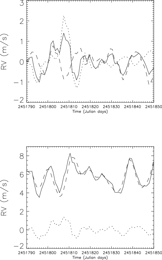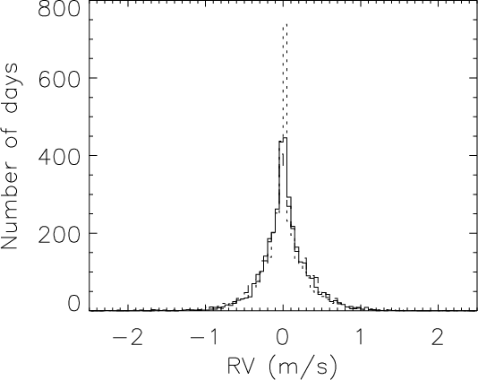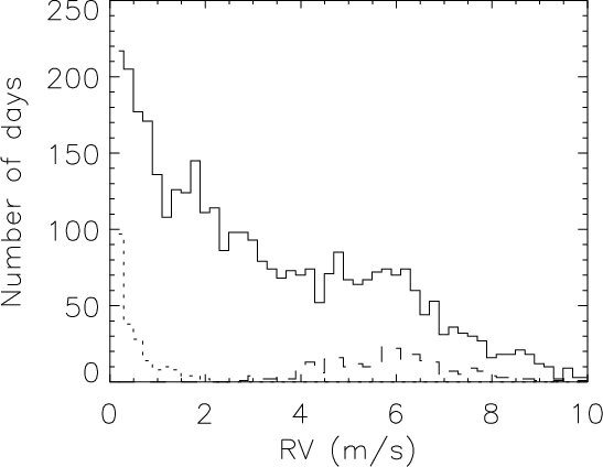 0.45 m/s (rms), with maximum peaks at 2 m/s, especially during the solar maximum (