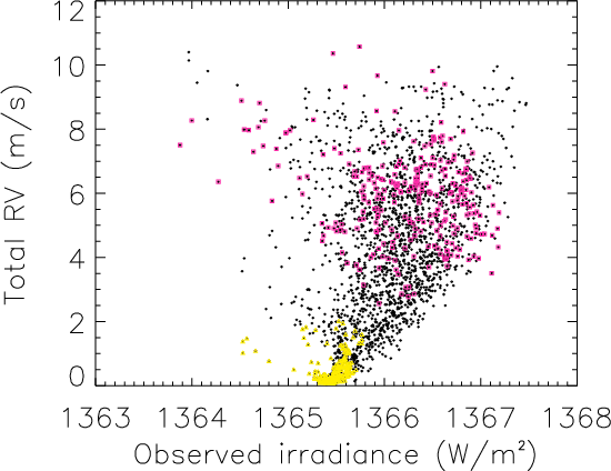 The RV is not correlated well with the total solar irradiance. Therefore a lack of correlation between observed RV and photometry should not lead to the conclusion that the observed RV cannot be due to activity. This is true for both the photometric contribution of spots and plages to the RV and for the convection signal. On the other hand, when the total RV is dominated by the convection signal, we expect from the present results a strong correlation with the Ca index. It is also dependent on the variability of the Ca index. The correlation remains very small, however, when only considering the photometric contribution of spots and plages to the RV.