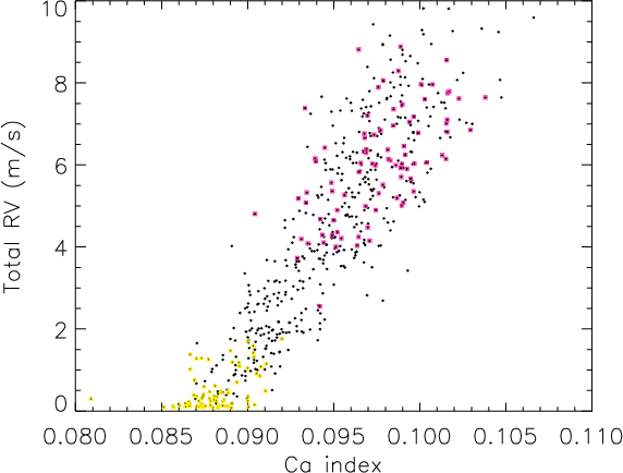 - The correlation with the Ca index is very strong. Such a correlation could be used to correct long-term RV variations, as done by Saar & Fischer (2000).