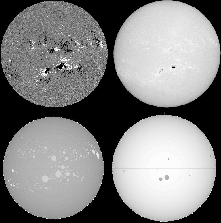 Figure 1: Upper panel: MDI magnetogram for September 14, 2002 at 4:48 UT (left) and Meudon photospheric spectroheliogram at 6:41 UT (right). Lower panel: simulated map showing the plages derived from the magnetogram with a contrast increased by a factor 10 for clarity ( left) and the spots from the USAF/NOAA data set at 12:40 UT (right). |