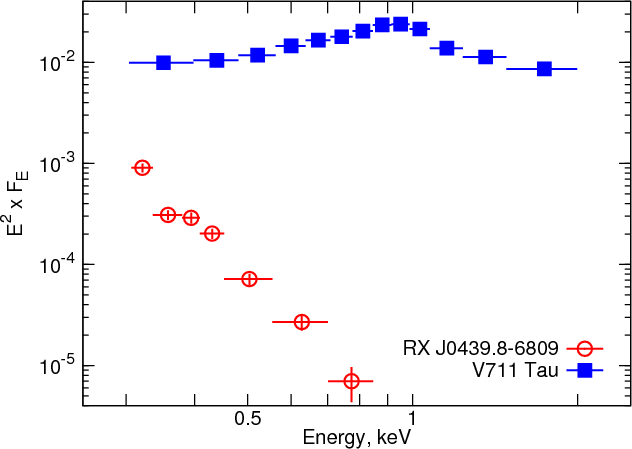 Figure 3: The spectrum of the active binary V711 Tau and of a steady nuclear-burning white dwarf of RX J0439.8-6809. The spectrum of the former was extracted using XMM-Newton data, while the latter was observed by Chandra. The background is subtracted from both spectra. |
