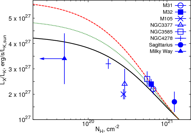 The sensitivity-corrected LX/LK ratio versus Galactic hydrogen column density. The solid line (black) shows the dependence of the absorbed flux on the |