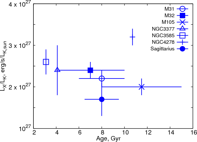 Figure 5: The sensitivity-corrected X-ray to K-band luminosity ratio versus the age of the stellar population. |