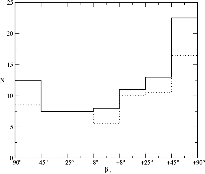 As the sample of objects modelled by this technique became significant, one could perform statistical investigations. Torppa et al. (2008) parametrized the shape models and found correlations both between shapes and rotational periods and between shapes and sizes. We were interested in the distribution of main-belt asteroids spin axes in space. This distribution is shown in Fig. 1, which shows only the spin axis ecliptic latitudes as we did not find any specific trends in the distribution of longitudes. The histogram contains all the reliable asteroid poles obtained with lightcurve inversion on full lightcurves (82 objects in all, DAMIT state for 6 November 2009). Where there was a mirror solution, both pole latitudes were taken each with the weight 1/2. The bins are identical to those in the paper by Kryszczynska et al. (2007), representing similar areas on the celestial sphere. The dotted line represents only the most certain solutions. The remaining solutions are considered ``preliminary'', although this notion most often refers only to the longitude of the spin axis. In the above-mentioned paper, asteroid spin axes were also referred to their orbital planes, but the distribution of spin axis latitudes remained very similar. Thus we refer the spin axes to the ecliptic plane only.