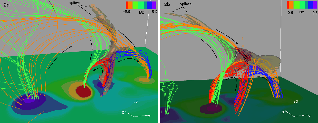 Figure 2 shows the three-dimensional emission of the jets. At t=144 (panel 2a) the leading and following loops (green and blue fieldlines respectively) reconnect along the current structure (transparent red isosurface), which adopts an arch-like shape. The orange field lines that join the positive polarity of the leading loop with the negative polarity of the following loop represent the magnetic domain of the envelope field. The arcade magnetic field is shown by the red fieldlines. At the beginning of the emission, the jet is directed vertically above the current, but eventually it becomes collimated along the reconnected fieldlines of the envelope field. The 3D visualization reveals that the jet adopts a double-peak structure (panel 2b). The spikes are developed at the leading edge of the jet and are moving along parallel fieldlines that belong to the same (envelope) field. At t=184 (panel 2b), the jets are emitted sideways from the rims of the current structure. They are directed on opposite sides along the ambient fieldlines.