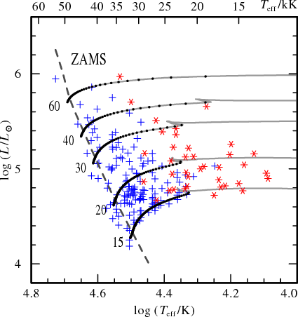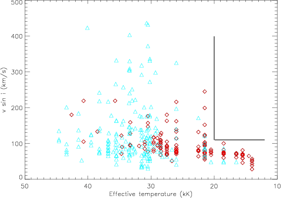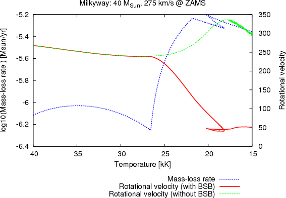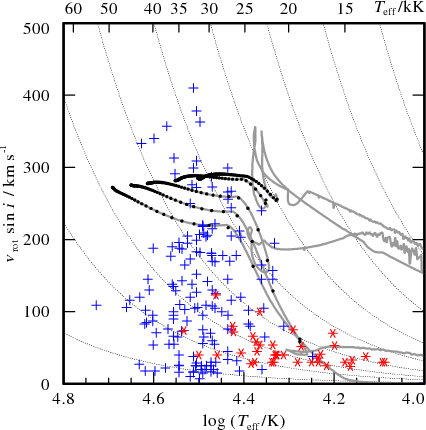 The second explanation for the steep drop in rotation rates is that both the objects cooler and hotter than 22 000 K reside on the MS, and that it is BSB that explains the slow rotation of the cooler B supergiants. The main argument for BSB is that it is predicted at the temperature where the rotational velocities are found to drop steeply. The evolutionary tracks in Fig. 4 indicate that the MS for the highest mass stars indeed appears rather broad, reaching as far as the BS-Jump temperature at 22 kK, and beyond. Therefore, mass loss seems capable of removing a considerable amount of angular momentum during the MS evolution for the highest mass stars.