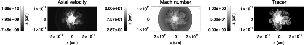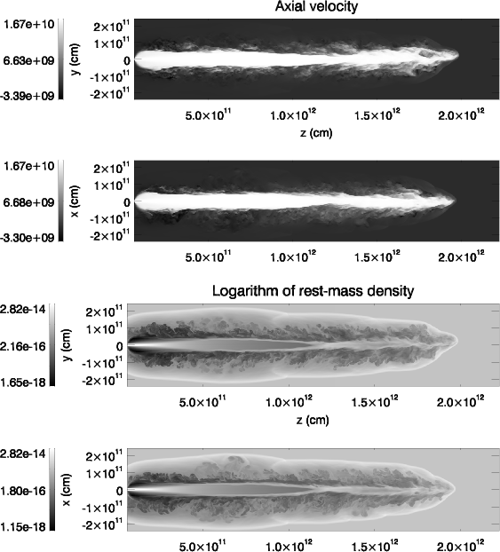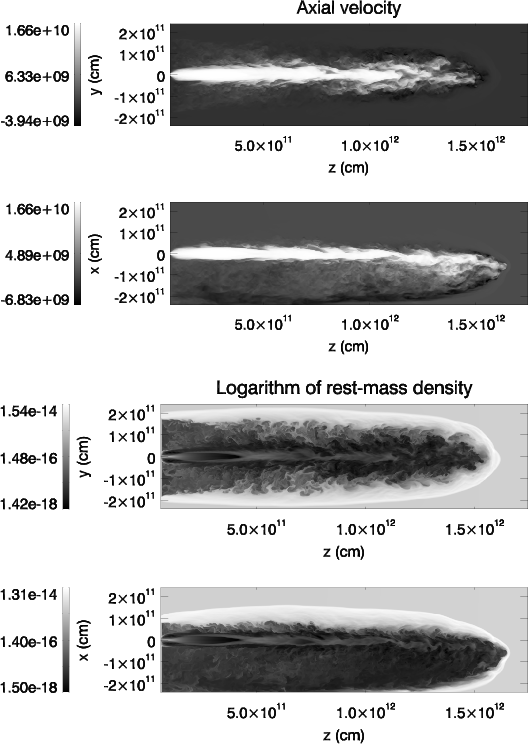 10-15 g cm-3 is the wind density at z0. We used the coordinate z for the direction of the initial propagation of the jet, x for the direction connecting the jet base and the star, and y for the direction perpendicular to z and x.