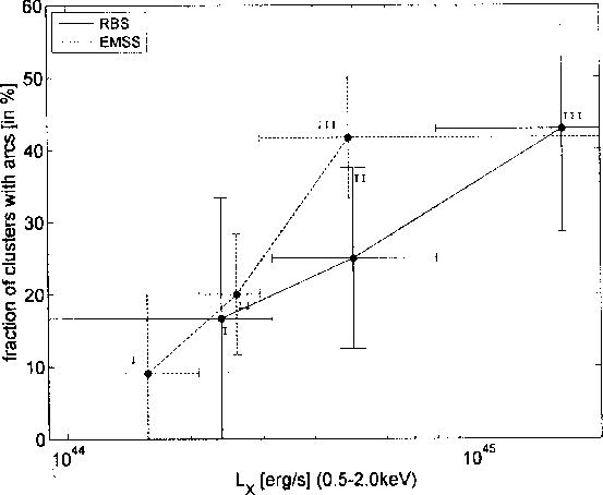 Comparison of the lensing cluster fractions in the EMSS sample (dashed line) (Luppino et al. 1999) and the RBS sample (solid line). For both samples we used only the most secure arc candidates (see Sect. 4.3). The dots mark the mean values of the X-ray luminosity within the corresponding |