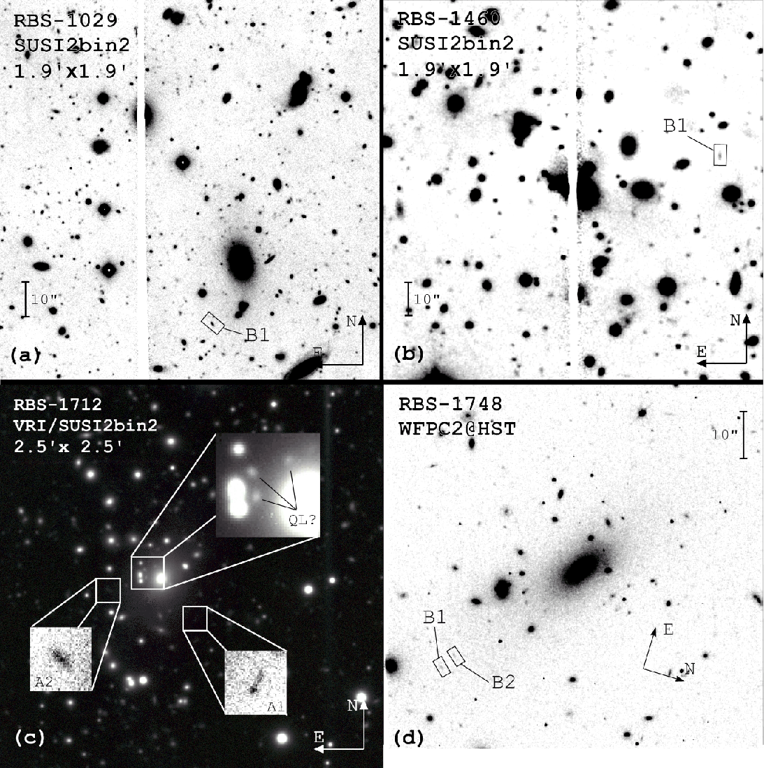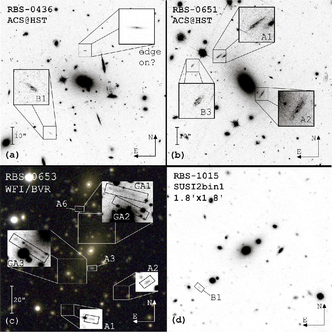 Images of all clusters with arc candidates (R-band filter except the three colour composite). The possible strong lensing features are marked by boxes, labelled with ``A'', and ``B'' (see Sect. 3.1).