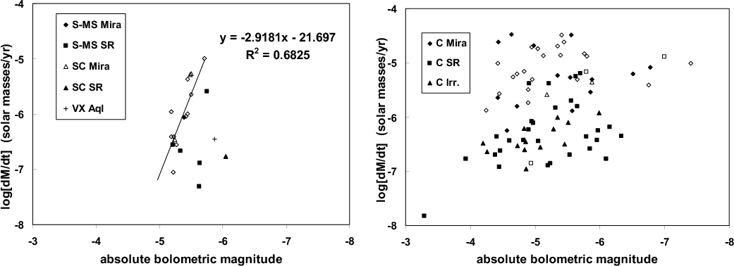 Figure 1: Left panel: the mass loss rates for S-type stars plotted as a function of their absolute bolometric magnitudes. Here and in the other plots of Fig. 2: 1) rhombs and squares are Mira and Semiregular S and MS stars respectively; 2) full symbols indicate sources with distance estimates derived from the Hipparcos parallaxes; empty ones are Miras whose distance has been estimated with the period-luminosity relations; 3) empty triangles are SC Miras with the distances calculated through the period-luminosity relations; the unique full triangle is a SC Semiregular with the distance obtained with the Hipparcos parallax. The estimates of the bolometric magnitudes come from Paper II. The least-square fit considers only S and MS Miras. Right panel: the mass loss rates for C-rich stars plotted as a function of absolute bolometric magnitudes (data from Paper I). Sources shown with a full symbol are from Table 1 of Paper I, while sources indicated with an empty symbol are from Table 2 of the same paper. |
