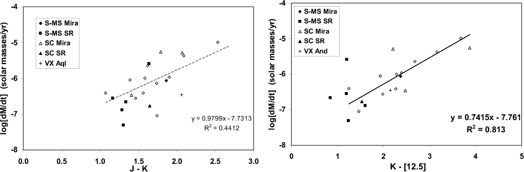 We can also examine the different results that we obtained in Fig. 2 if we use a near-IR color ((J-K) in the left panel) or a near-to-mid infrared color ( (K-[12.5]) in the right panel) as a function of the mass loss rates. In the left panel (J-K color), the Miras seem to show a relation, but the data are quite scattered; instead, in the right panel (K-[12.5] color) the least-square line that we computed for the Mira S-MS sources has a much better coefficient of correlation than in the previous case. On the other hand, Semiregulars are very scattered in both plots, without signs of clear patterns in their behavior. In Paper I we pointed out that the entity of the overlapping region between Miras and Semiregulars could vary with the colors in abscissa. In this case Miras and Semiregulars are again quite well separated in both plots, but this effect is best enhanced if a near-to-mid infrared color is adopted.