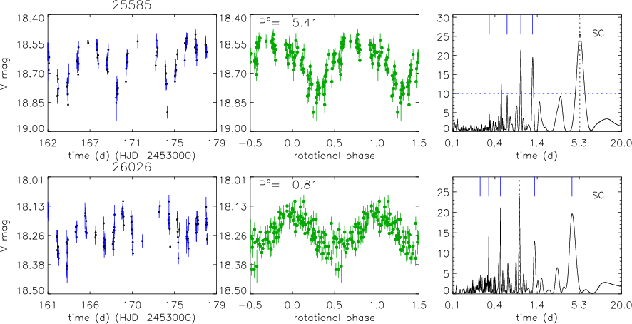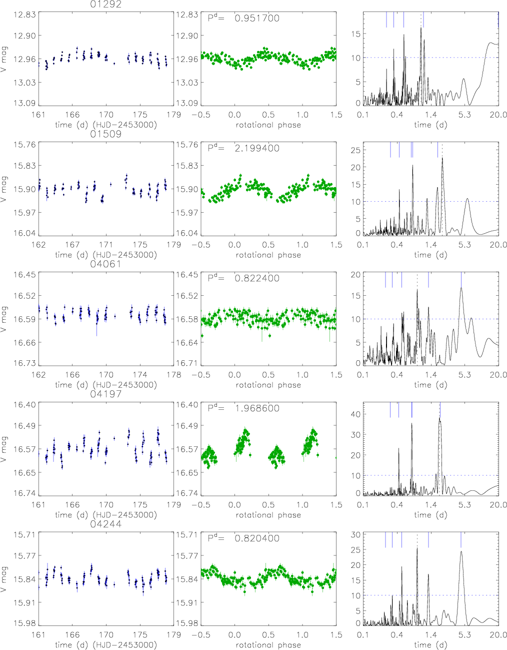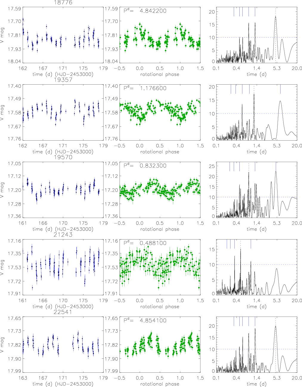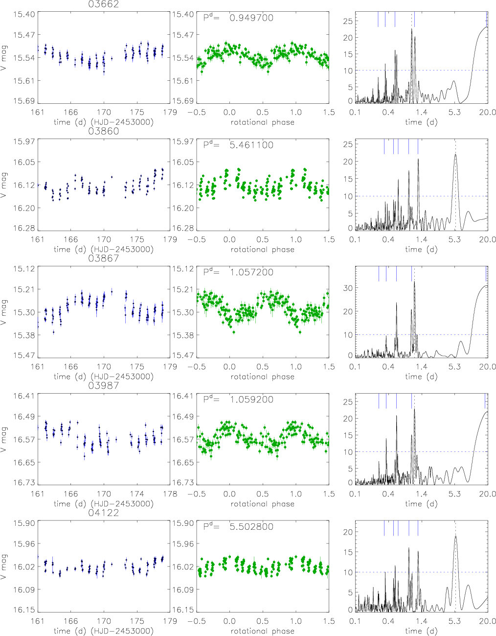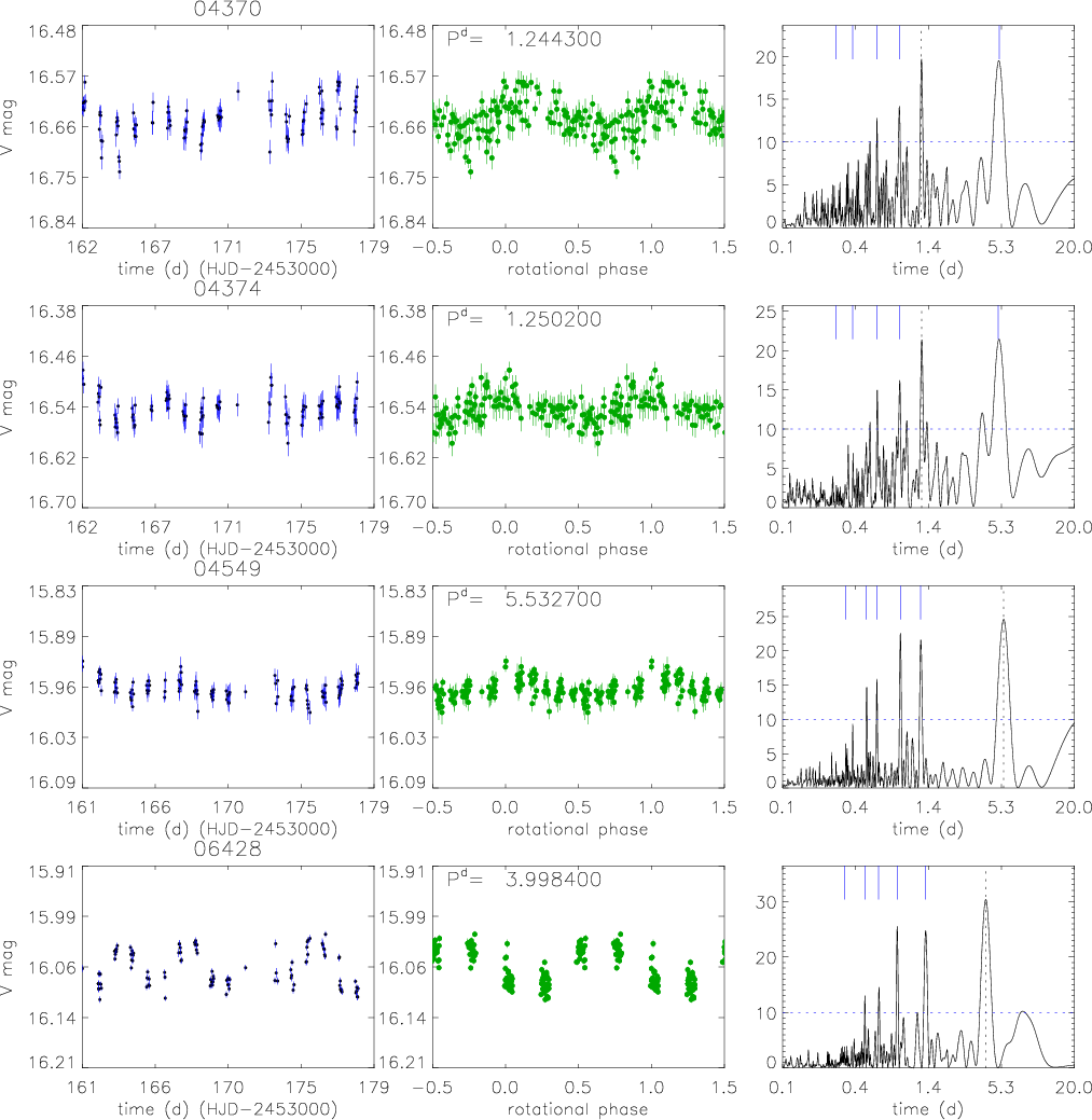 Figure 10: High-probability ``a'' periodic candidate cluster members. From left panel: V-band time series, phased light curve, and Scargle periodogram. See Sect. 4 for a detailed description. |