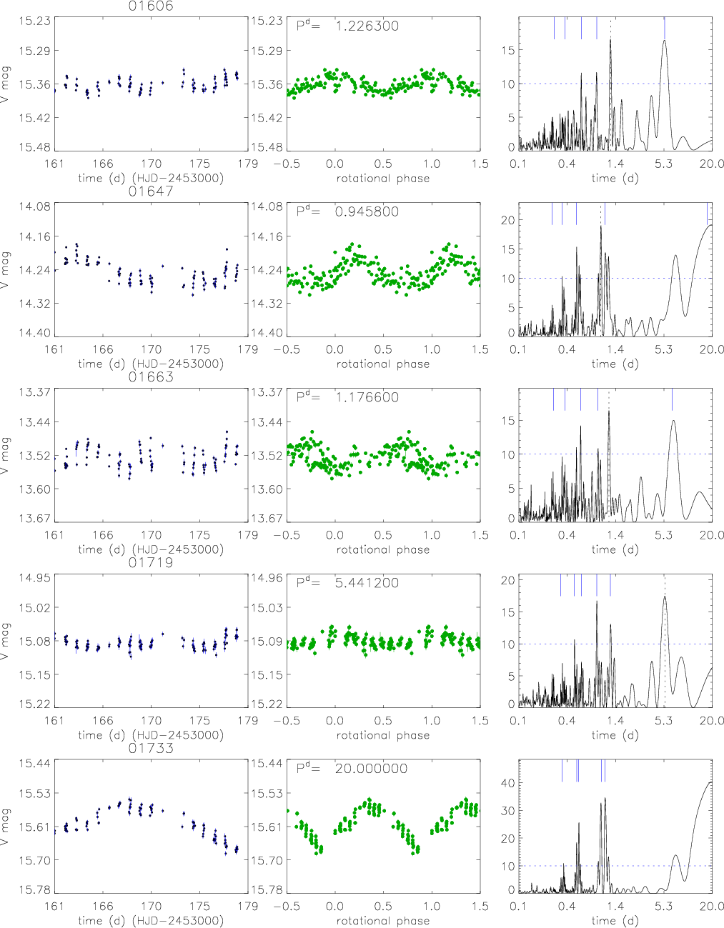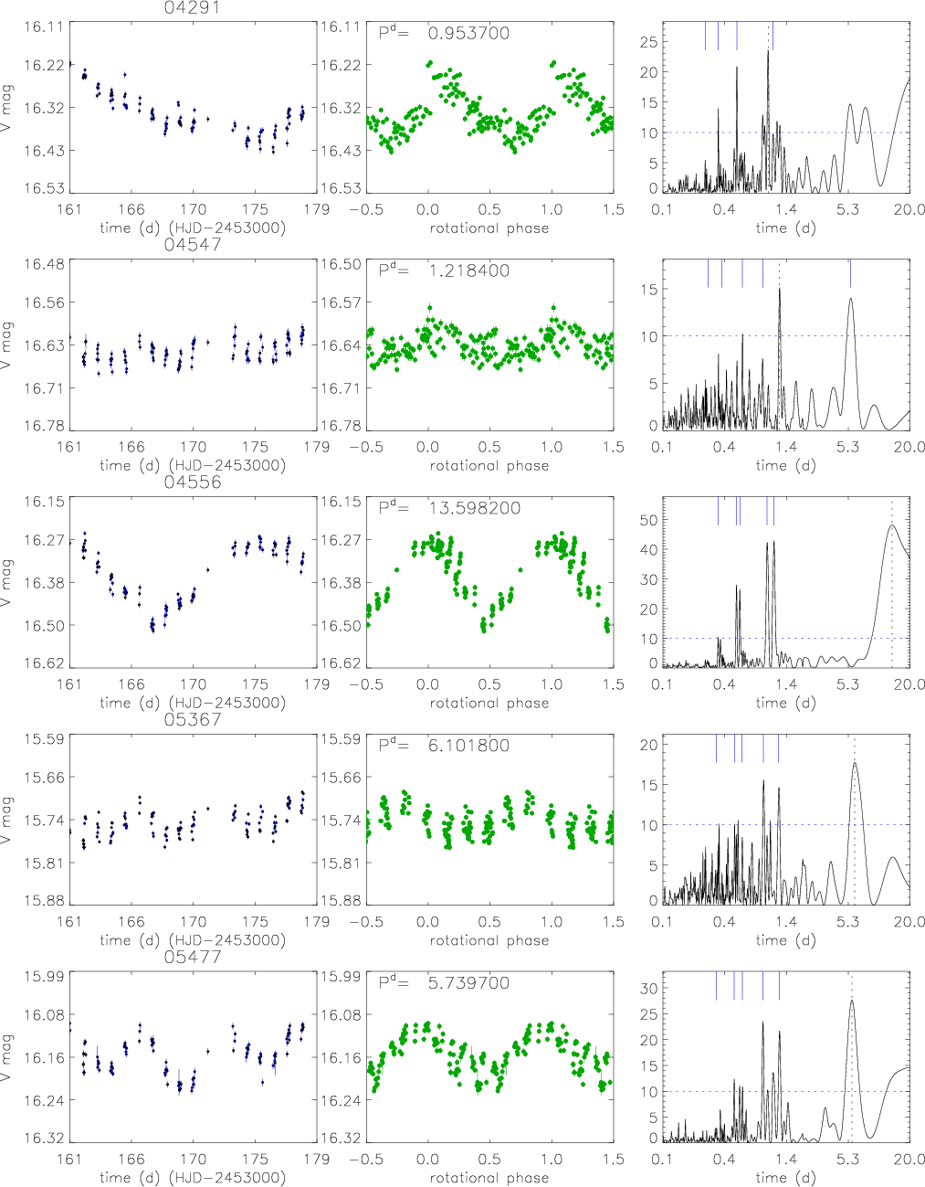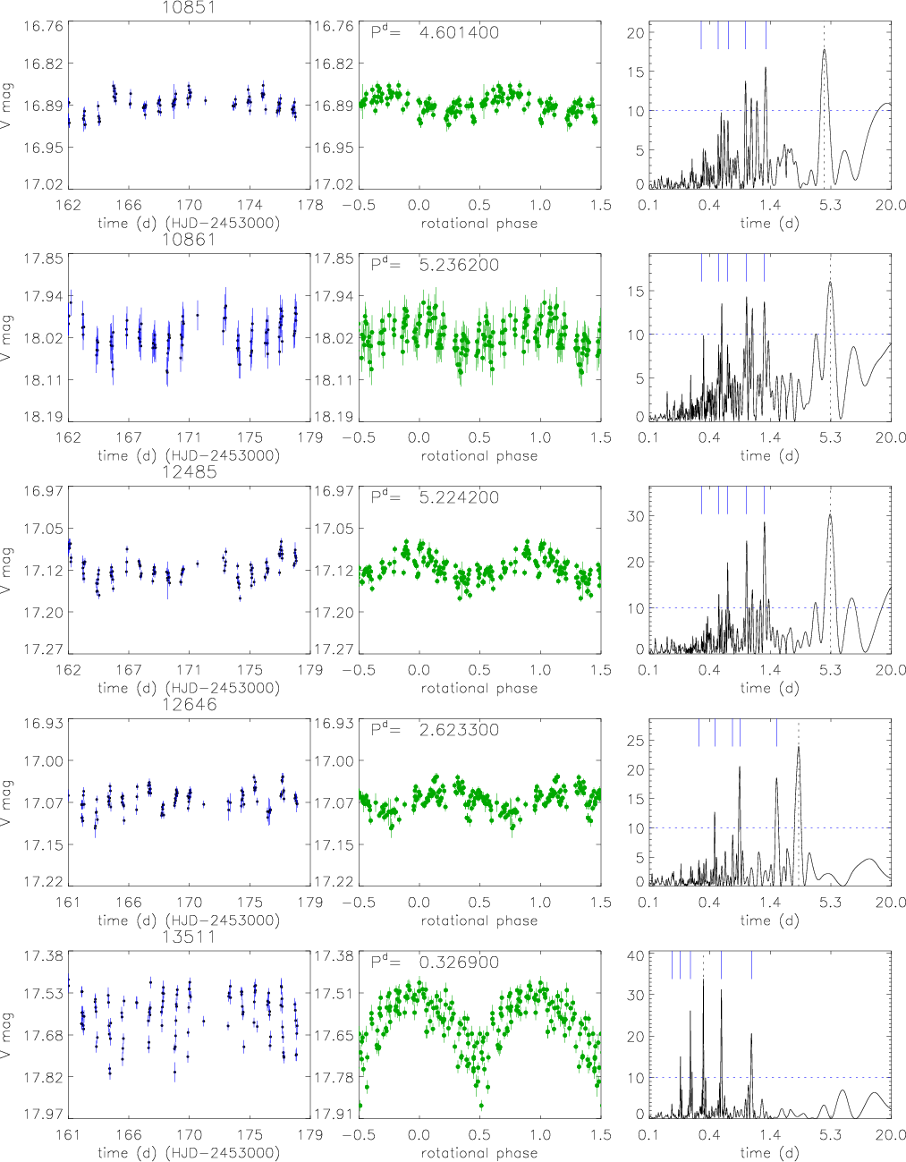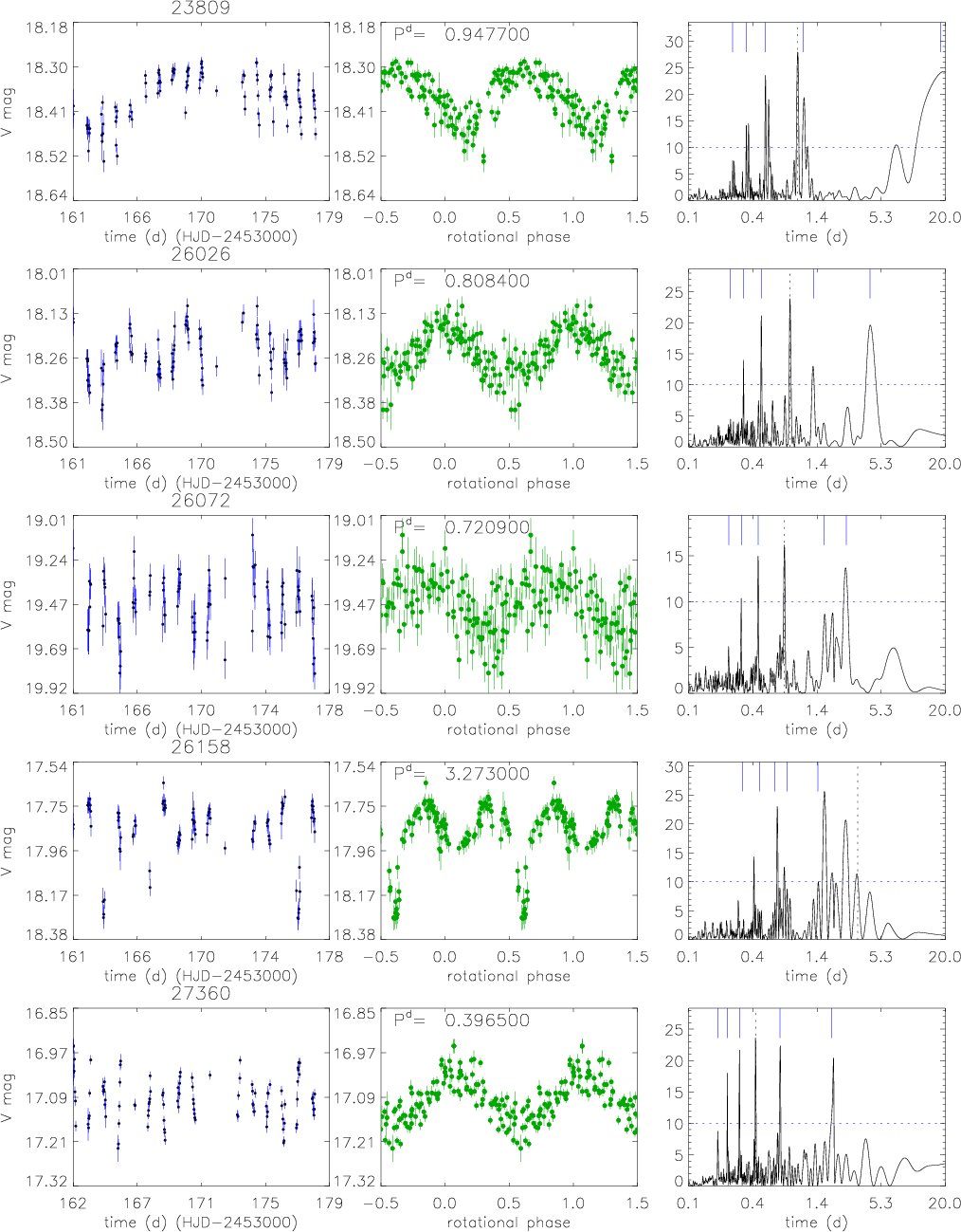 Figure 10: High-probability ``a'' periodic candidate cluster members. From left panel: V-band time series, phased light curve, and Scargle periodogram. See Sect. 4 for a detailed description. |
