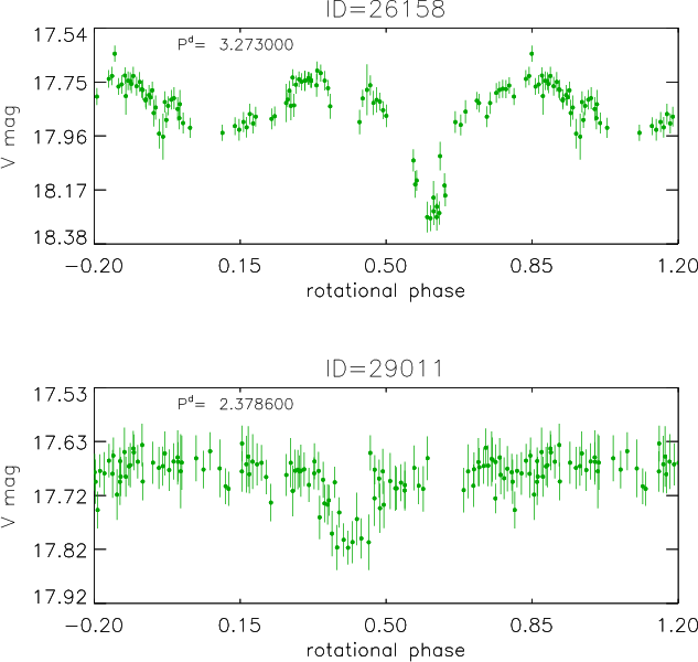 Figure 18: Periodic cluster non-members discovered in the FoV of M 11. From left panel: V-band time series, phased light curve, and Scargle periodogram. See Sect. 4 for a detailed description. |