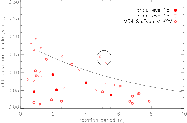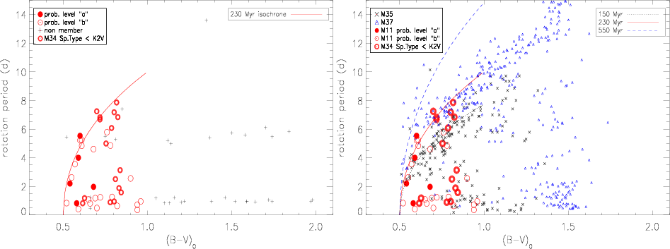 - The median period we determined is longer than the median period P=4.4 d of G stars in the younger cluster M 35 and shorter than the median period P=6.8 d of G stars in the older cluster M 37. This result is in good agreement with the expected scenario of rotation spin down with age according to the Skumanich rotation decay law.