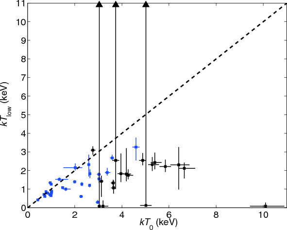 for a single thermal fit was 1.46, 0.976 for two thermal components, and 0.984 for three thermal components. The simulations were done for a 100 ks observation with the background and thermal normalization taken from A1795's central annulus. All thermal components were given the same input normalization.