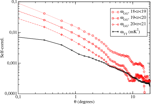 ) from the 5th year WMAP release (Hinshaw et al. 2009). We use the V-band (61 GHz) data because of its lower level of pixel noise. We checked that the results of this paper are approximately similar if we use the W-band (94 GHz) data. There is no need to subtract foreground Galactic contamination because this is not correlated with galaxy counts (corrected for extinction), and because this is small in off-plane regions. In any case, the published foreground corrections might not be enough accurate (López-Corredoira 2007). We assign the same weight to each WMAP pixel of equal size.