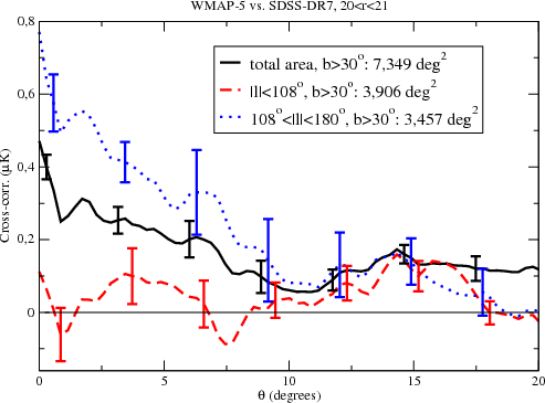 We note that Bielby et al. (2010) measured the correlation of WMAP anisotropies with emission-line galaxies selected photometrically from SDSS and inferred a non-significant correlation, with large field-to-field errors comparable to those we obtain (we are cautious in interpreting their result, however, because the cross-correlation in the different subfields are not independent and this affects the way in which they have been using to determine the rms). They claim that their result implies that possibly emission line galaxies are more strongly clustered and less correlated with microwave anisotropies, something that is not entirely clear to us. In our opinion, the results of Bielby et al. (2010) of non-significant cross-correlation may be correct and there is unlikely to be a difference in the interaction of galaxies with the background CMBR that is caused entirely by them having emission lines. Sawangwit et al. (2010) failed to measure a significant cross-correlation between the luminous red galaxies of SDSS-DR5 and WMAP. On the other hand, they found some positive correlation of WMAP with 2SLAQ survey, and negative correlation of WMAP with the AAOmega survey. Analyses by Hernández-Monteagudo (2008) demonstrated that the cross-correlation of WMAP/SDSS-DR4 should have at least within a signal/noise ratio of 0.7-1.7, much lower than the significance obtained by the authors cited above. These results might be interpreted as independent confirmations of our results here.