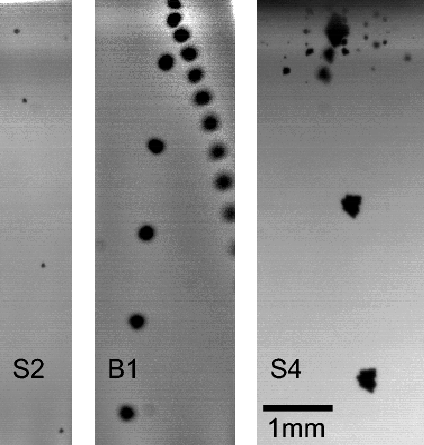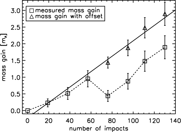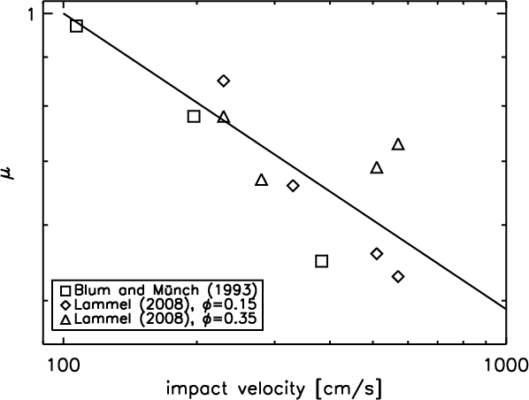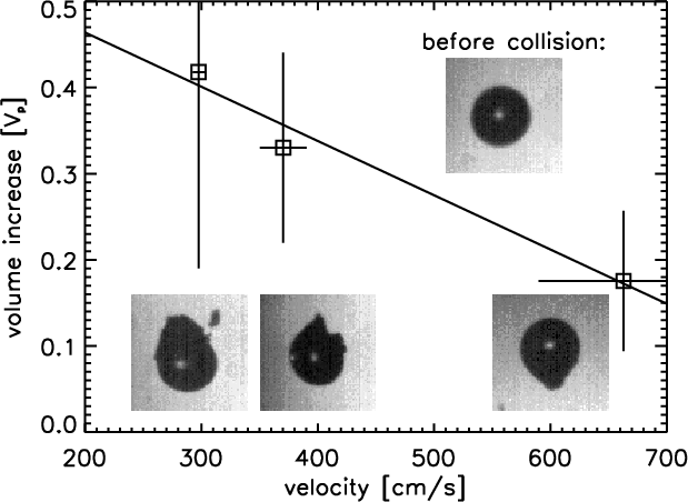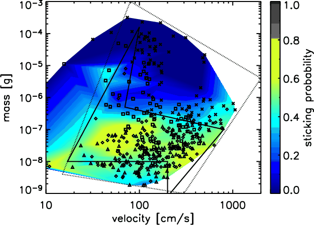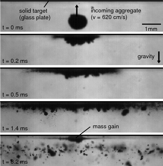 Exp. 1-4: A well-known growth mechanism for small dust aggregates is the hit-and-stick growth, in which the aggregates collide with such a low kinetic energy that they stick at each other upon first contact without any restructuring. The first experiments to unambiguously show that the hit-and-stick process is relevant to protoplanetary dust aggregation were those by Wurm & Blum (1998), Blum et al. (1998,2000,2002) and Krause & Blum (2004). These proved that, as long as the collision velocities for small dust aggregates stay well below 100 cm s-1, sticking collisions lead to the formation of fractal aggregates. This agrees with the molecular-dynamics simulations by Dominik & Tielens (1997) and Wada et al. (2008,2007,2009). The various experimental approaches for Exp. 1-3 used all known sources for relative grain velocities in PPDs, i.e. Brownian motion (Exp. 3), relative sedimentation (Exp. 1), and gas turbulence (Exp. 2). In these papers it was also shown that the hit-and-stick growth regime leads to a quasi-monodisperse evolution of the mean aggregate masses, depleting small grains efficiently and rapidly. For collisions between these fractal aggregates and a solid or dusty target, Blum & Wurm (2000, Exp. 4) found growth at even higher velocities, in which the aggregates were restructure. This also agrees with molecular-dynamics simulations (Dominik & Tielens 1997), and so this first stage of protoplanetary dust growth has so far been the only one that could be fully modeled.