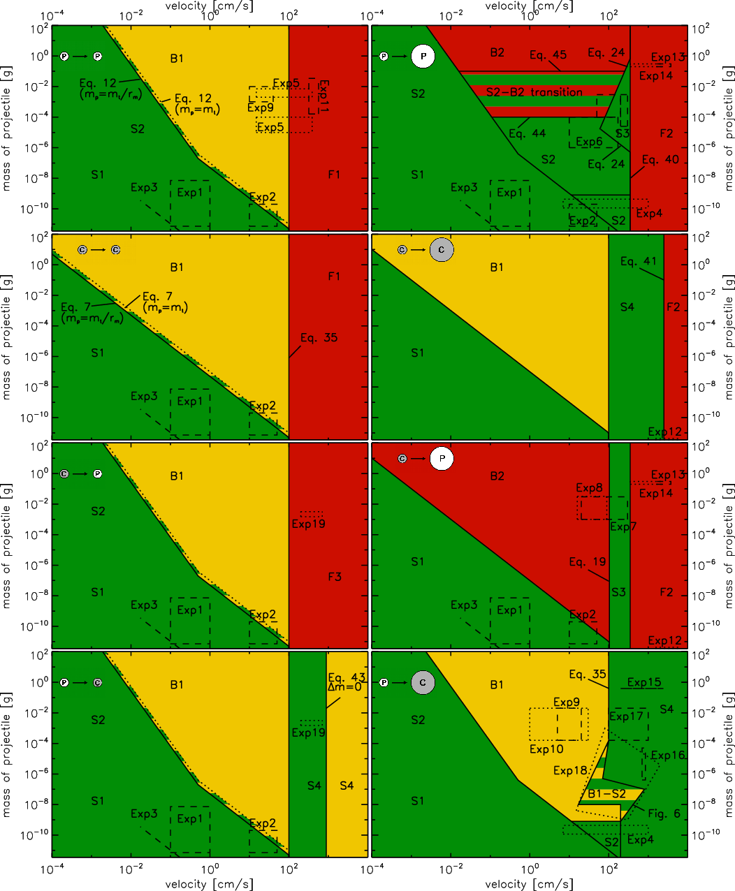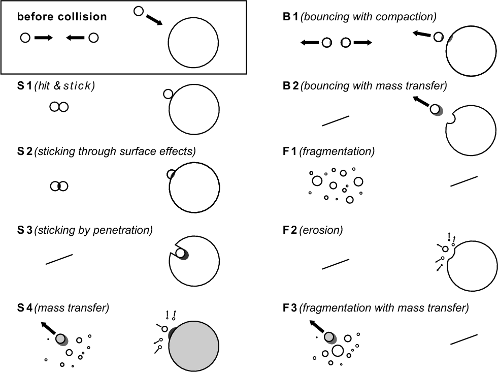 Figure 1: We classify the variety of laboratory experiments into nine kinds of collisional outcomes, involving sticking (S), bouncing (B) and fragmenting (F) collisions. All these collisional outcomes have been observed in laboratory experiments, and detailed quantities on the outcomes are given in Sect. 3. |