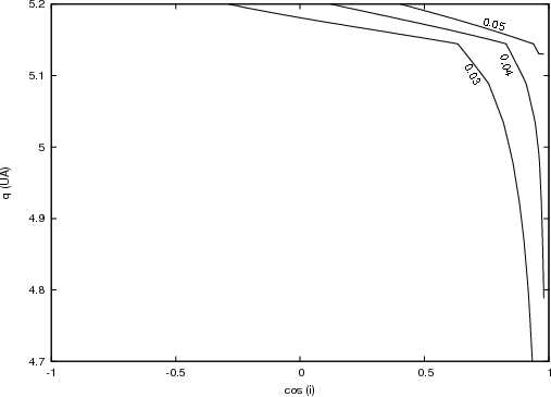 Some of the features present in the Figures can be explained in the framework of the analytical theory of close encounters (Greenberg et al. 1988; Valsecchi & Manara 1997; Opik 1976; Carusi et al. 1990).