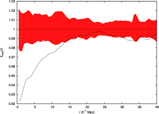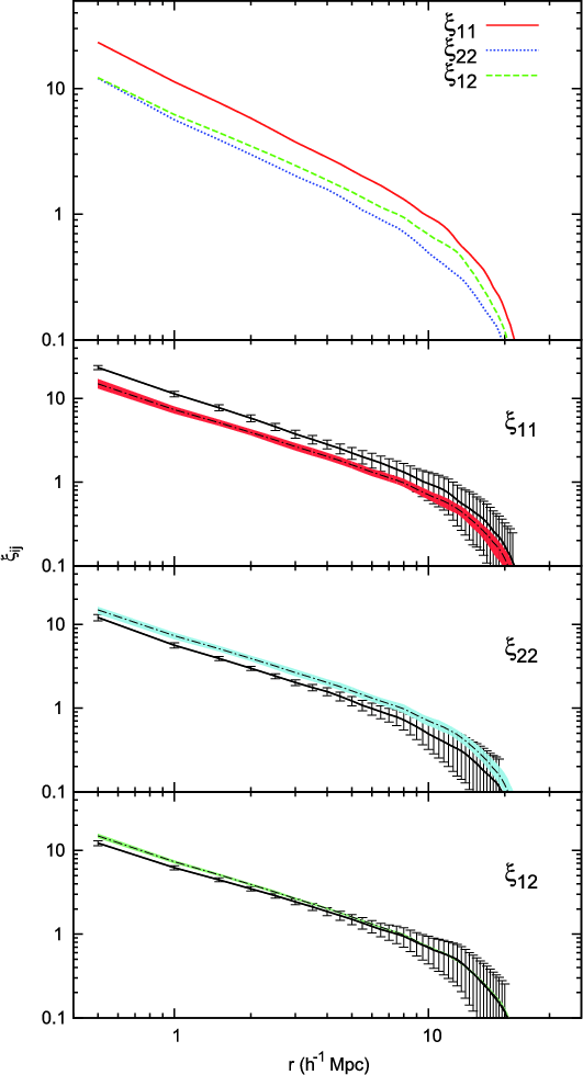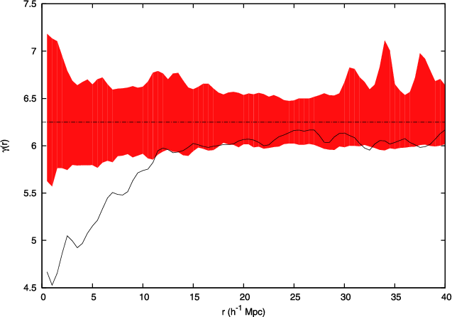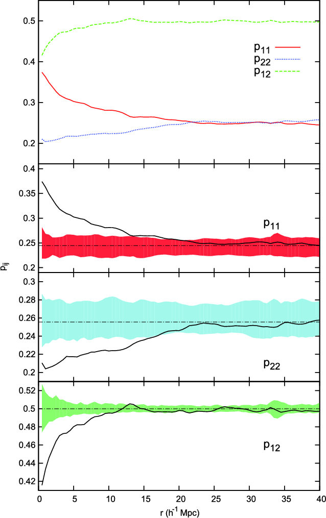 Figure 5: Mark connection functions pij(r) obtained for ``early-type'' (population ``1'') and ``late-type'' (population ``2'') galaxies in our sample. The top panel shows the three functions together. The three bottom panels show p11(r), p22(r), and p12(r) separately (solid lines), together with the shaded band showing the minimum and maximum values for the 200 realizations of the random relabeling simulation. The dot-dashed lines correspond to the expected values for the random labels case according to Eq. (8). |