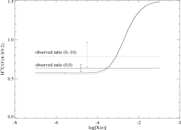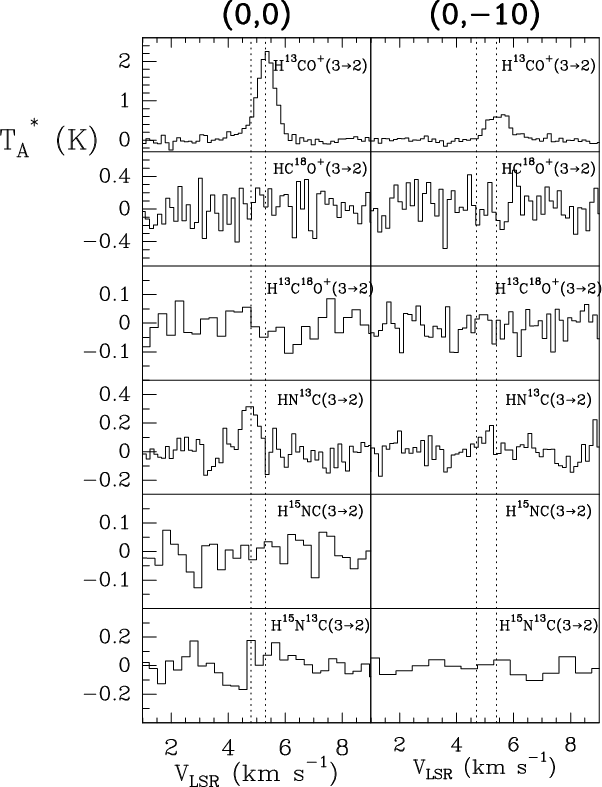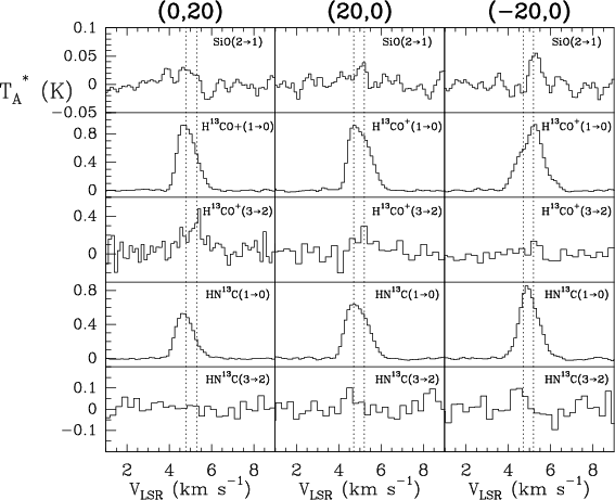Anomalies in the intensities of the hyperfine components of the strongly polar HCN molecule were reported on large-scales toward the TMC-1 molecular dark cloud by Cernicharo et al. (1984). These authors showed that these anomalies are due to large opacity effects and are produced by the re-emission of radiation coming from the densest part of the core, by a more extended and less dense envelope. If this applies to the L1448-mm case, then we should expect to detect such differences in the excitation of other strongly polar molecular species such as HCO+ and HNC, on large-scales around the L1448-mm core. In Sect. 4, from isotopologue observations we have shown that the precursor component of H13CO+ is optically thin toward (0, 0), and if the emission is extended, this component is also optically thin toward (0, -10). This implies that the over-excitation of H13CO+ in the precursor toward these positions cannot be due to a large-scale optical depth/scattering effect.