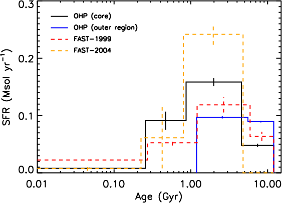 This paper is organised as follows. Section 2 presents the data acquisition, reduction, and analysis strategy used in this paper. Section 3 presents age, metallicity, and the kinematical distribution profiles for this galaxy. In Sect. 4 we discuss a more in-depth approach to the SF history analysis. The overall discussion is found in Sect. 6 while the main conclusions are recalled in Sect. 7.