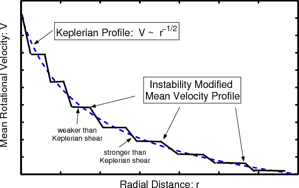 about saturation of the instability. Shear profiles q are given by the local background Keplerian mean, q0, plus time-independent departures, Q(x), with zero average on a given scale.