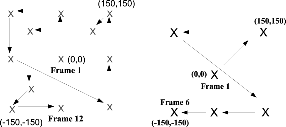 frames. The position (0, 0) indicates the initial position of NGC 3957 in one CCD. Right: dithering pattern for a set of six consecutive V-band exposures. Units are given in pixels. One pixel is 0.205