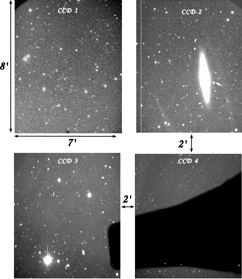 2440 pixels each. With a resolution of 0.205'' per pixel, each CCD covers 7'