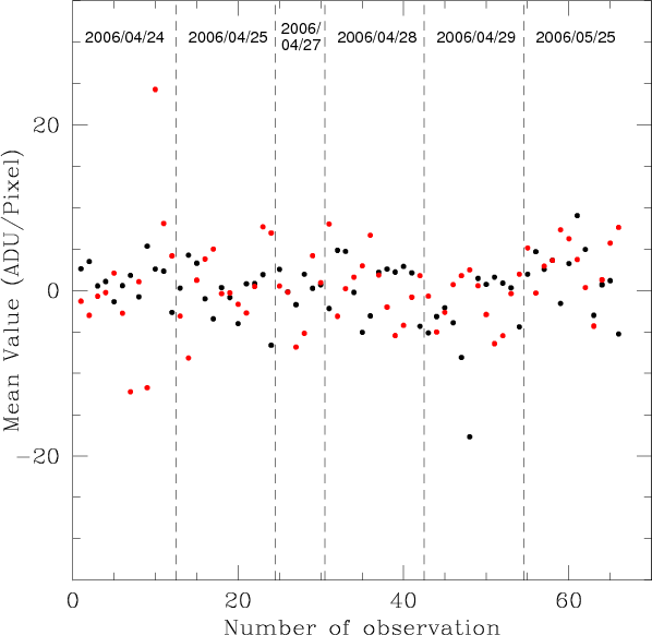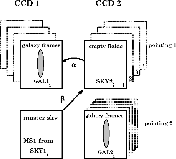 As already mentioned, we used two different pointings. We will use the following terminology throughout: Pointing 1 corresponds to a set of exposures placing the galaxy in CCD1 and dithered following the patterns of Fig. 1. Pointing 2 has the same dithering pattern as Pointing 1, but the galaxy is now placed in CCD2. The exposures on the empty field in CCD1 (when the galaxy is in CCD2) and CCD2 (when the galaxy is in CCD1) are used to determine the background level and shape.
