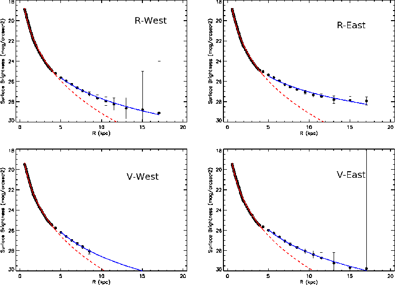 from the galaxy center, rendering photon-noise negligible. The 1 detection limits are R = 30.6 mag/arcsec2 and V = 31.4 mag/arcsec2.