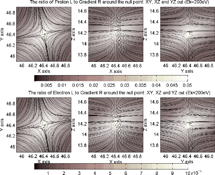 - For both protons and electrons, the final parallel velocities were much higher than the perpendicular velocities and the V-B pitch angles were approaching 180 degrees. This means that the particles escaped from the null along the magnetic field lines outward and downward to the photosphere. Particles did not escape to the upper corona because of the non-symmetric configuration of the coronal magnetic field, which is weaker at higher altitudes and has fewer up-going open field lines connecting to the null.