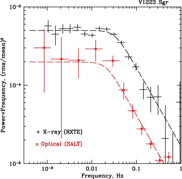 We demonstrated that high quality power spectra of optical and X-ray variability of the intermediate polar, V1223 Sgr (accreting white dwarf with a magnetosphere that disrupts the accretion disk at relatively large distances from white dwarf surface), are very similar to each other. Both power spectra have a very distinct break at a Fourier frequency which we associate with the Keplerian frequency at the inner radii of the truncated accretion disk. At higher Fourier frequencies the power spectra steepen.