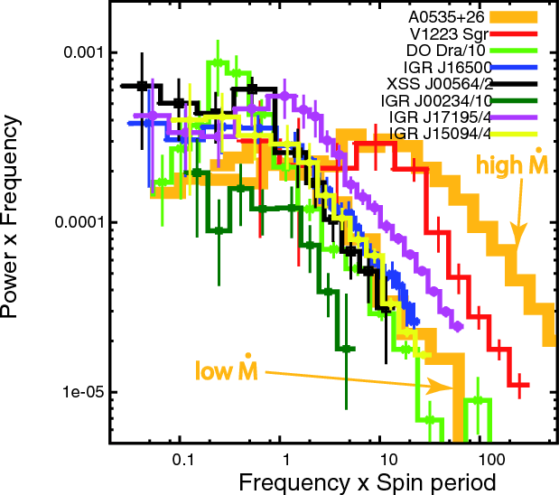 Figure 3: Power spectra of optical variability of a sample of intermediate polars. Power spectra of DO Dra, XSS J00564+4548, IGR J00234+6141, IGR J17195-4100, and IGR J15094-6649 were scaled down for clarity by factors, written on the figure. For comparison we present two power spectra of accreting X-ray pulsar A0535+26, collected during episodes of high and low mass accretion rates (thick solid histograms). See text for the details. |