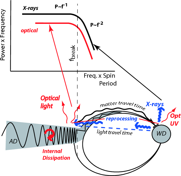 In the framework of our model we predict that on this plot all accreting magnetic white dwarfs, in which the inner parts of the accretion disks are in corotation with white dwarf magnetospheres, will have breaks in the power spectra at a value around unity, i.e. around the WD spin frequency (see e.g. Fig. 3 and Table 2). If the accretion disk continues significantly below the corotation radius, the break in the power spectrum should be observed at a higher Fourier frequency.