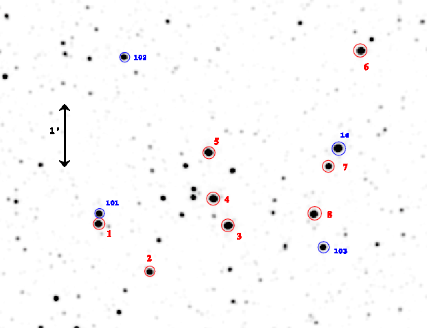 Finding chart for Alicante 8, with the stars listed in Table 1 indicated. The finder comprises a K-band image from 2MASS with a
