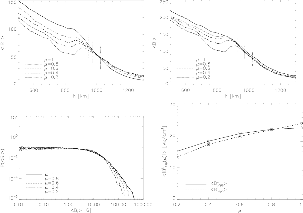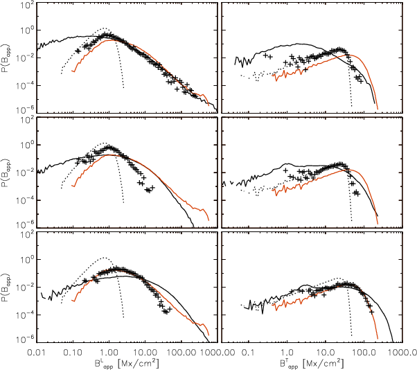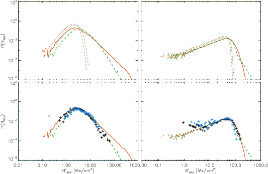 We note, however, that the conclusions drawn here are based on a simple assumption drawn from the properties of magnetic field in the simulations with different magnetic Reynolds numbers. The increase in the field strength by a factor of 2 or 3 would result in a change of physical parameters, as well as the dynamics of the plasma, since the strong field is much less susceptible to the influence of the turbulent motions. These effects are not considered in our scaling procedure. Thus, we consider our work to be a step towards revealing the role of the surface dynamo in the quiet Sun magnetism until more realistic simulations, as well as higher resolution observation of the solar photosphere become available.