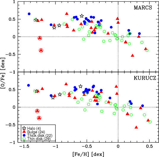 Kurucz and MARCS models yielded the abundances of O, Na, Mg, Al, Si,