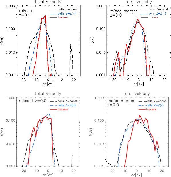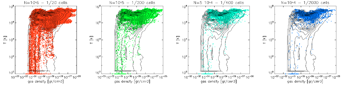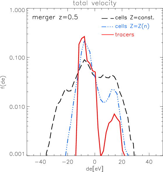 Yet, some interesting information of Lagrangian nature cannot be followed by these methods. One example is the distribution of metals in the ICM due to diffusion and turbulent mixing which cannot be followed, unless the conservation equations are self-consistently implemented for every metal species, with a sizable increase in algorithmic complexity and computational expense. However, it is possible to treat metals in a post-processing stage by following their spatial evolution through that of mass-less particles (tracers), which move along with the baryon gas.