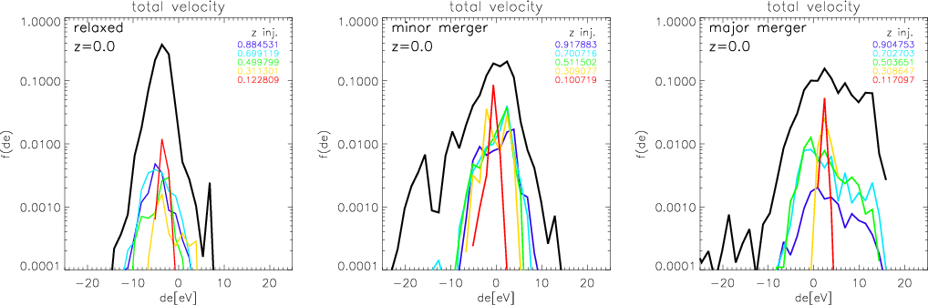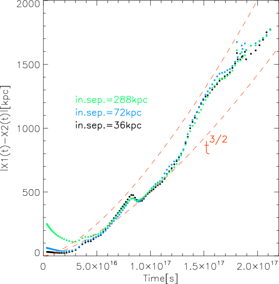The paper is organized as follows: in Sect. 2 we present the details of the simulation runs for this project, and the method to inject and follow tracers. In Sect. 3 we discuss the result of several convergence tests to assess the reliability of tracers simulation with different possible setups. In Sect. 4 we present astrophysical results of tracers, studying in particular the average transport properties of tracers in all simulated clusters by discussing the evolution of the pair dispersion statistics (Sect. 4.1); the morphology and the evolution of radial mixing in merging and non merging clusters through the evolution of tracers initially located in spherical shells (Sect. 4.2); the spreading of metal tracers in the ICM, studying toy models of metal injections from galaxies (Sect. 4.3); the simulated emissivity from the broadened Fe XXIII line from metal tracers and its dependence on the the dynamical history of clusters (Sect. 4.4). Our conclusions are given in Sect. 5.