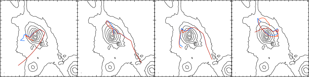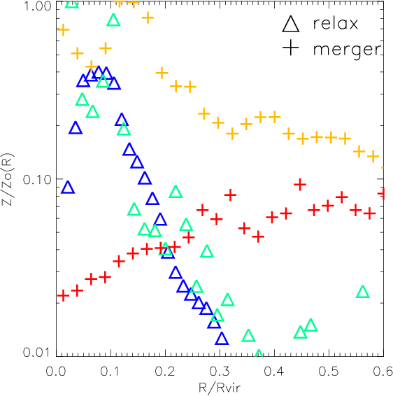 ) between the position of the DM and gas peaks are common; since X-ray observations are usually referred to the luminosity peak to derive profiles, we stress that this may have an effect because the bulk of metals is released by galaxies.