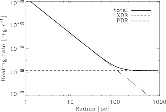 In the centers of active galaxies, the supermassive black hole will emit radiation in a broad range of frequencies. Particularly interesting is the emission of X-rays, as those photons can penetrate molecular clouds even at high column densities. The resulting cloud temperatures range from a hundred K up to 1000 K (Meijerink et al. 2007; Meijerink & Spaans 2005; Maloney et al. 1996; Lepp & Dalgarno 1996). Such X-ray dominated regions have been reported for instance in NGC 1068 by Galliano et al. (2003). Due to the high ambient pressure, higher-density clouds may form due to the thermal instability (Wada & Norman 2007).